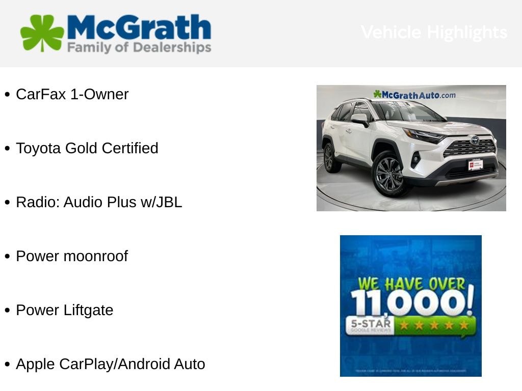 As a Toyota Gold Certified pre-owned vehicle, this RAV4 Hybrid has undergone a rigorous 160-point inspection and comes with a transferable warranty, roadside assistance, and the peace of mind that comes with Toyota's reputation for quality and reliability.