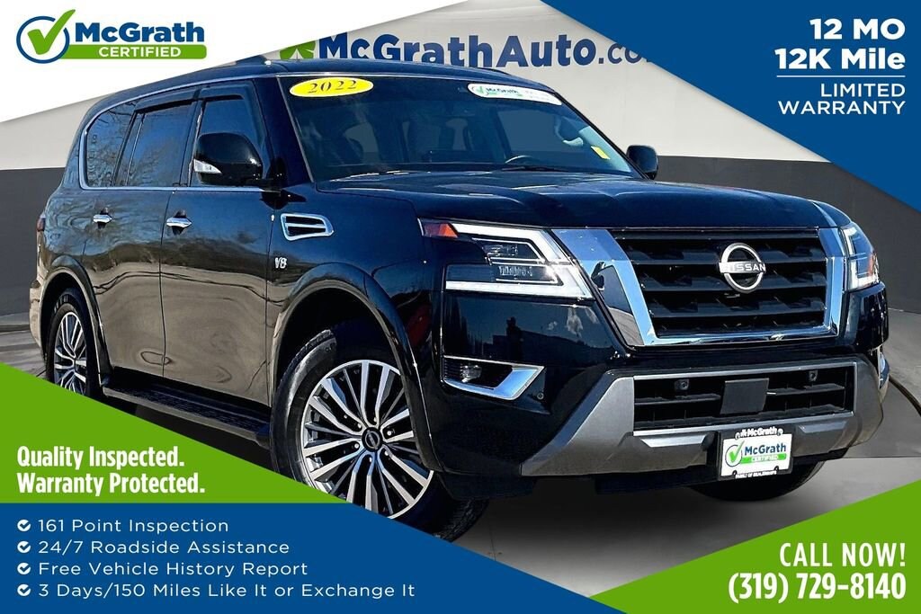 Elevate Your Driving Experience with the Powerful 2022 Nissan Armada SVThis 2022 Nissan Armada SV is a true force to be reckoned with on the road. Boasting a commanding 5.6L V8 engine that delivers an impressive 400 horsepower, this SUV is ready to tackle any adventure with ease. Paired with a smooth-shifting 7-speed automatic transmission and the confidence of 4-wheel drive, the Armada SV offers the perfect blend of power and capability.- Clean Carfax- SV Appearance Package- Cargo Package- 3rd Row Carpeted Floor Mats - Bench SeatStep inside the Armada SV and you'll be greeted by a wealth of premium features designed to elevate your driving experience. Enjoy the convenience of a power liftgate, auto-dimming rearview mirror, and universal garage door opener. Stay connected with the NissanConnect infotainment system, complete with Apple CarPlay and Android Auto integration. And with seating for up to eight, this Armada has the versatility to accommodate your growing family or active lifestyle.Beyond its impressive capabilities, the Armada SV also boasts a sleek and sophisticated exterior. The bold, distinctive styling turns heads wherever you go, while the 20-inch alloy wheels and front fog lights add a touch of refined elegance.This Armada SV has been meticulously maintained and is now available for your consideration. With low mileage and a clean Carfax report, this SUV is ready to provide years of reliable and enjoyable service. Don't miss your chance to make this impressive Nissan Armada SV your own.As a certified pre-owned vehicle, this Armada SV has undergone a thorough inspection and reconditioning process to ensure it meets the highest standards of quality and performance. You can drive with confidence, knowing that this SUV has been meticulously cared for and is ready to take you on your next adventure.Prices may change at any time and are subject to availability and prior sale. Taxes, title, license fees, and a $180 documentation fee are not included. Payments shown are estimates; actual terms vary by buyer and credit approval. Dealer is not responsible for errors in pricing or vehicle details, information is believed accurate but not guaranteed. Photos are for illustration only confirm details with the dealer. Some vehicles come with a $1295 Clear Guard package. Fuel economy ratings and driving range figures are based on EPA estimates for new vehicles, and actual mileage and range may vary. By submitting your phone number, you consent to occasional SMS or calls about our products and promotions; standard messaging rates apply. See dealer for details. Fuel economy figures are official EPA estimates and clearly labeled as such.
